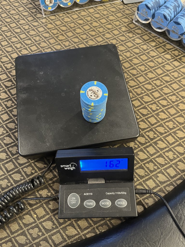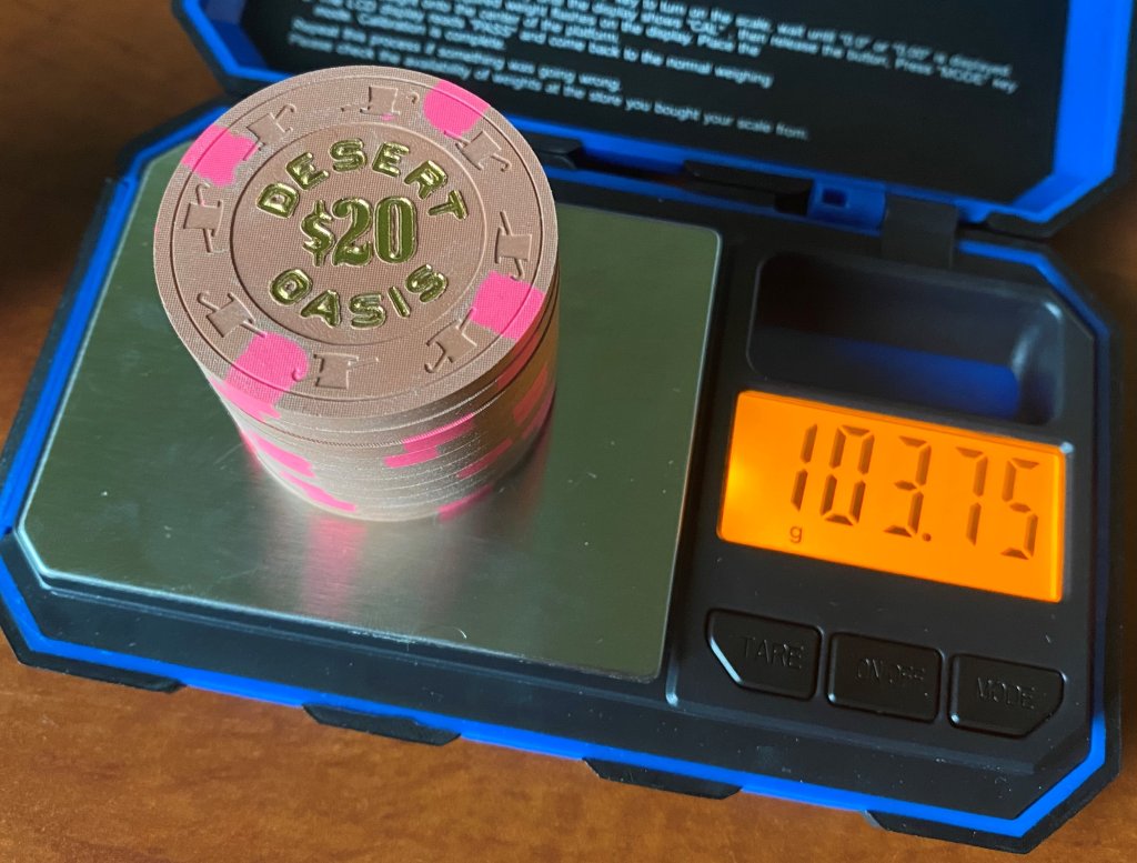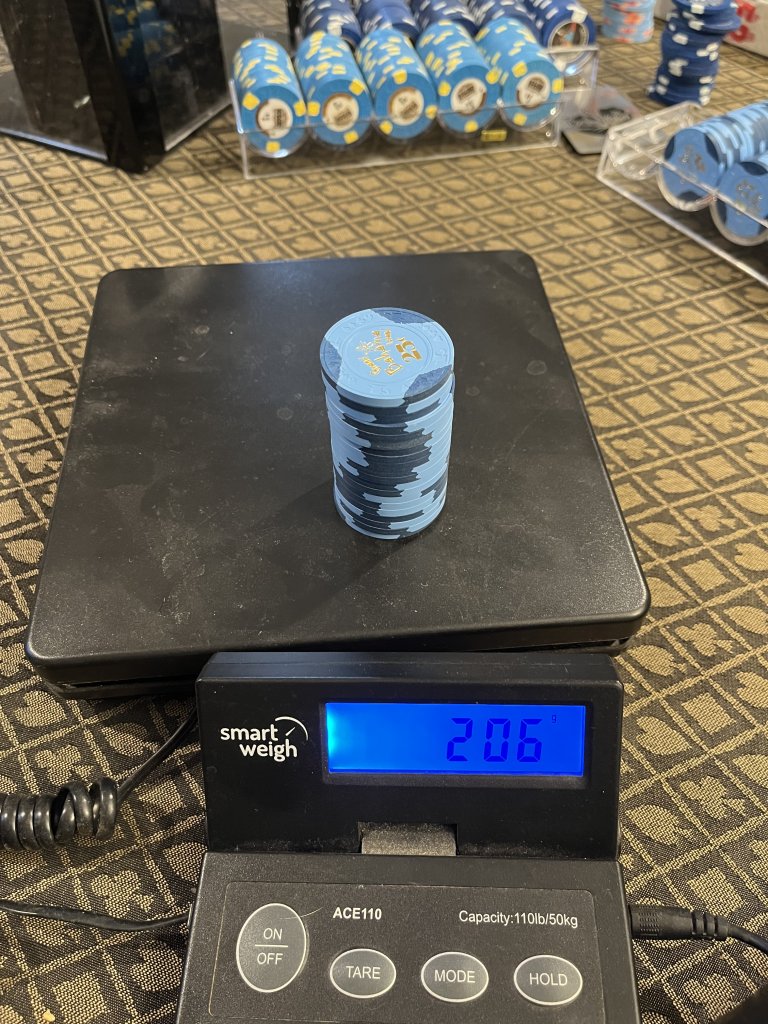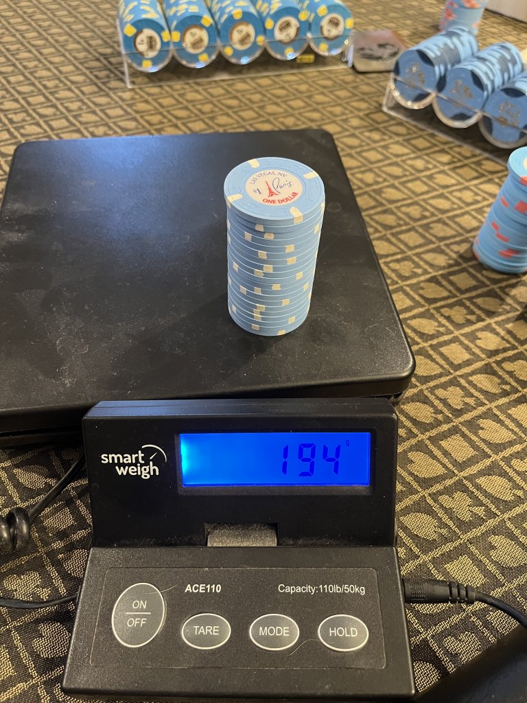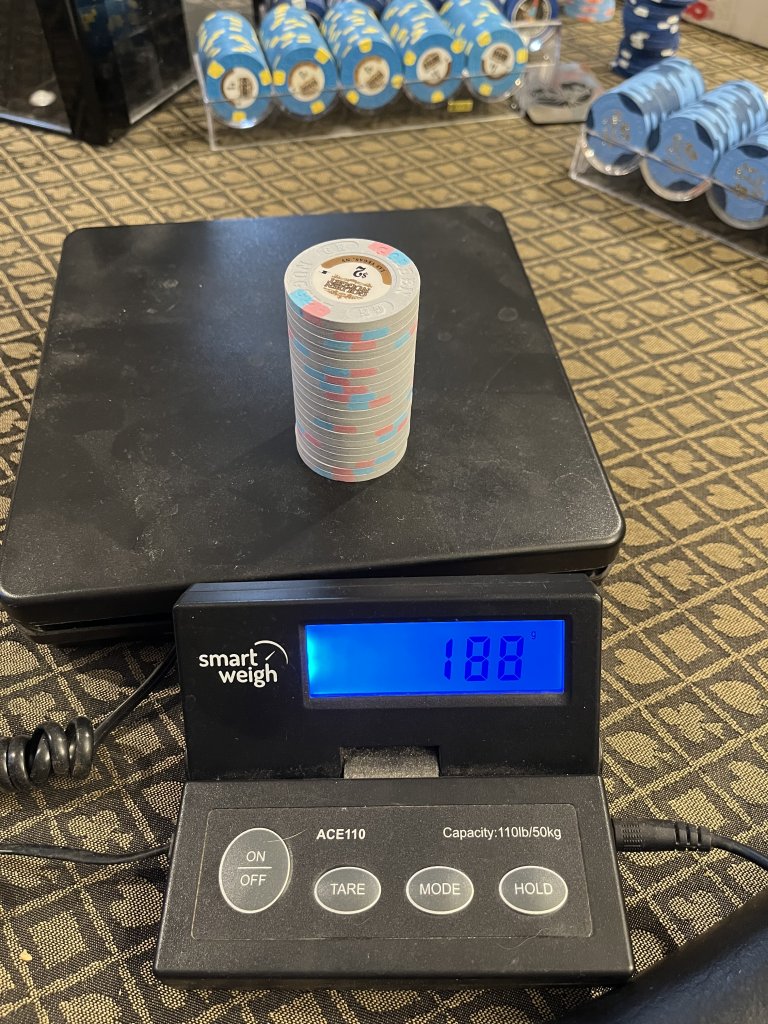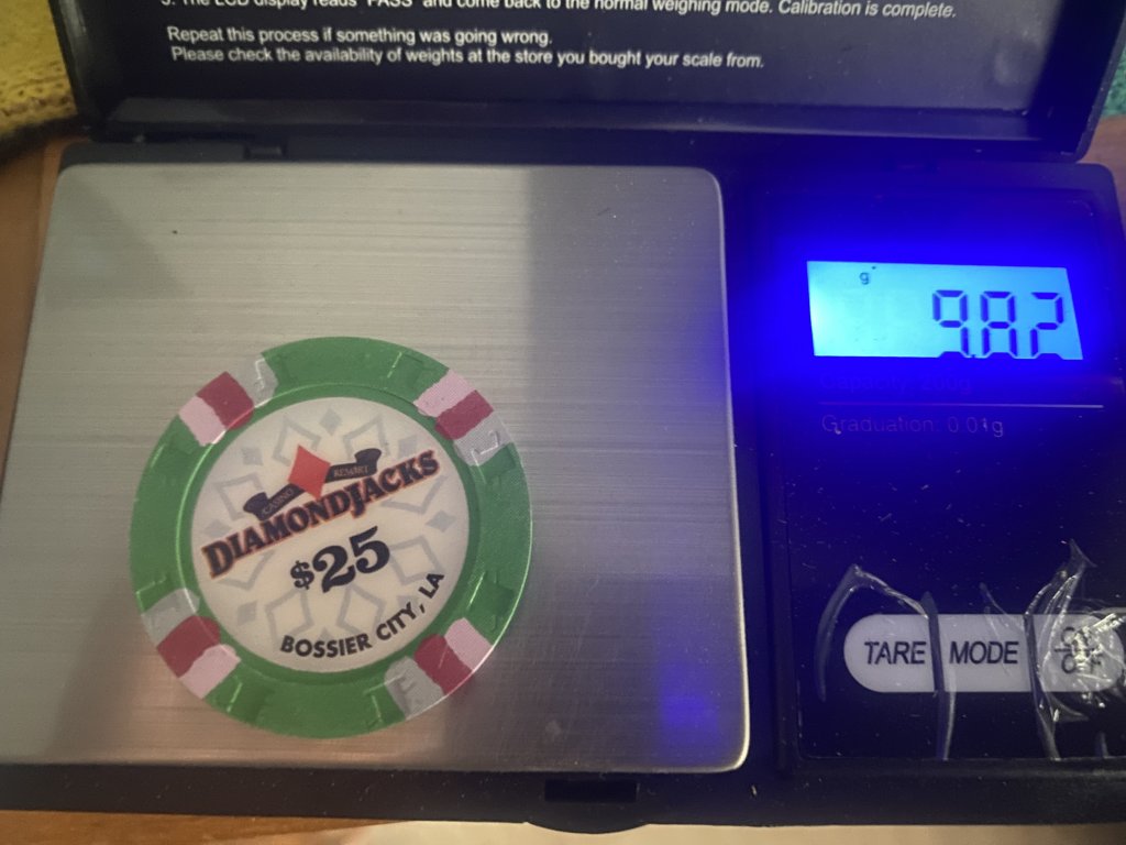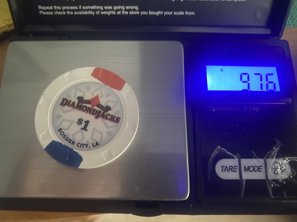 Example the Diamond Jack chips for sale soon weigh 10+ grams for tournament rhc chips, those chips were produced in 2005 clearly since casino opened in 2006 summer, so the .5% limit right?! No, 10+ grams is highly leaded esp being rhc and the cash chips weigh in the high 9 grams most of them in which these same colors nowadays are the high 8’s low 9’s. Which makes them moderately leaded.