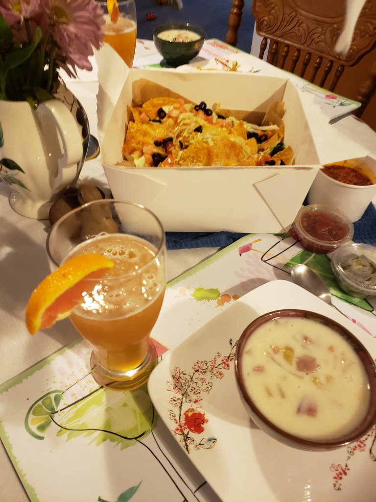 Takeout nachos from one of our favorite places (Klondike Kate's in Newark, Delaware), homemade ham and potato soup, and a Blue Moon.