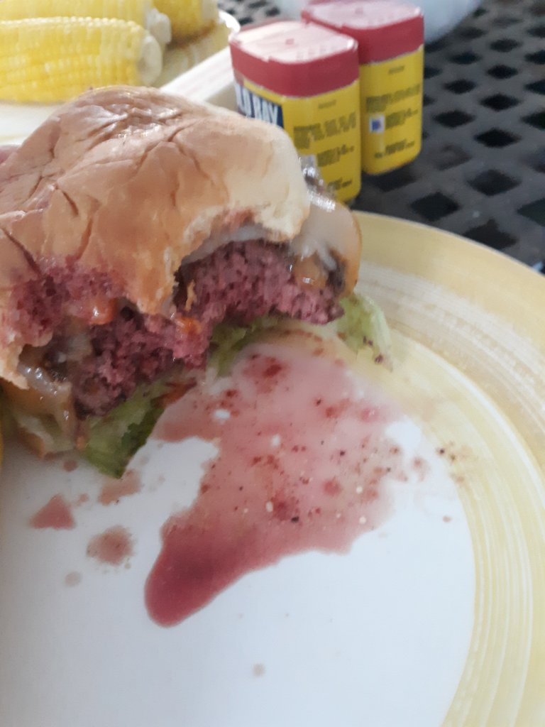 We were starving and dinner got pushed back an hour from a rain storm, we pulled them off the grill bunned them and started eating, I already had the corn going down the hatch lolLooks perfect. You needed to let it rest a few minutes longer to maintain the juices