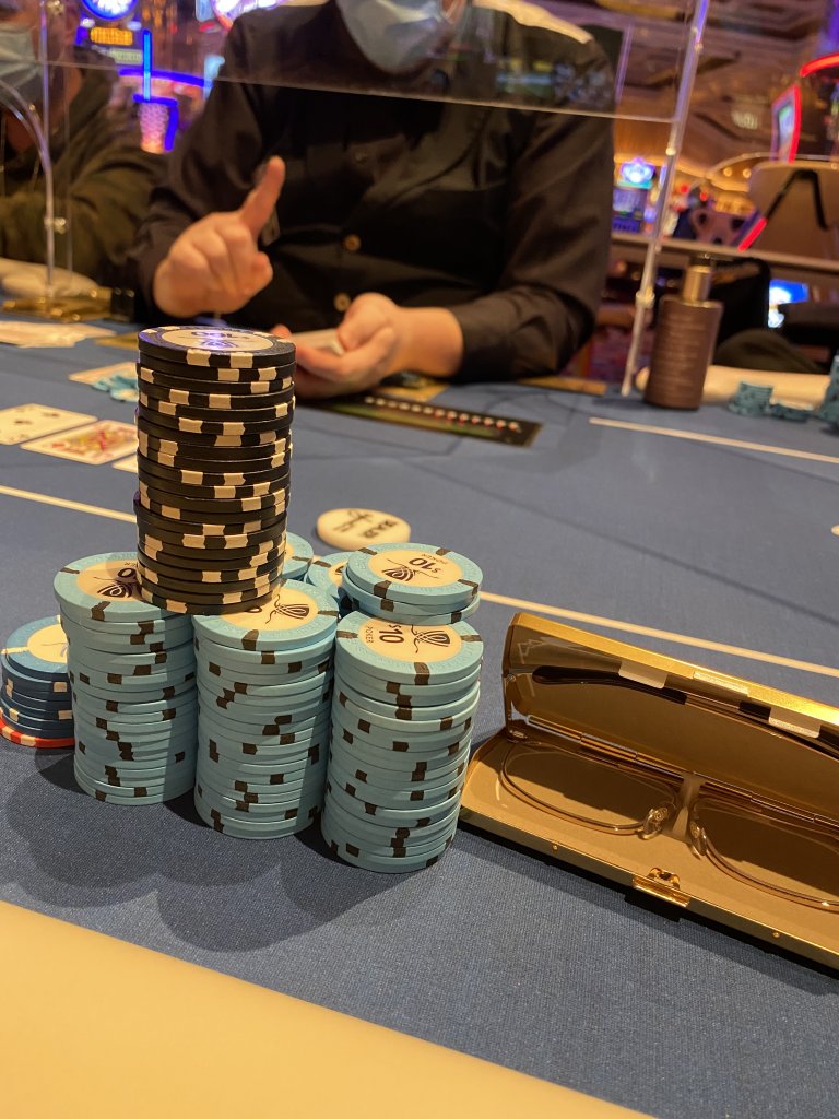 Hahah, no, he’s telling someone that one chip needs to be out for a blindThat picture looks like the dealer is scolding you for taking photos at the table, lol.