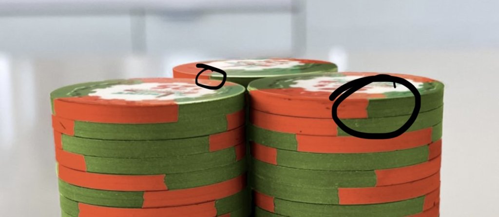 How come the edge spots don’t match the face on the top chips in the right and back stacks?