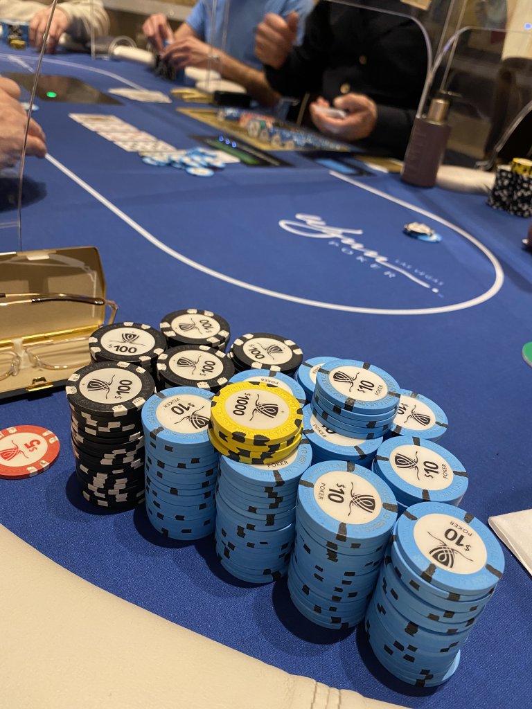 You can see a few red chips here and there. Since the game plays so big, there are usually just a few reds around for the small blind.if its 5/10 where are the 5s?